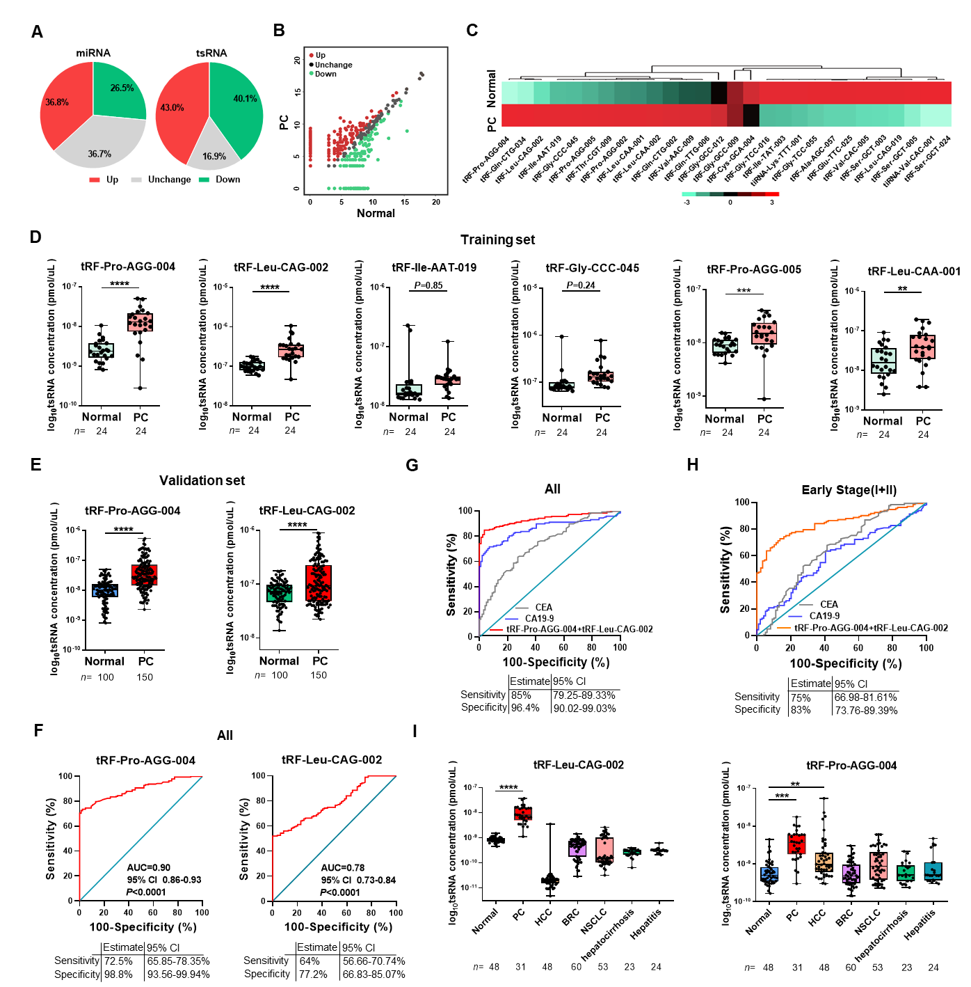 胰腺癌是一种发病隐匿、早期诊断困难的高恶性肿瘤,多数患者一经确诊就处于晚期,失去了治疗机会。因此,亟需寻找具有高灵敏度和高特异性的标志物对其进行早期诊断和预后评估,以提高治疗效果。 tRNA-derived small RNAs (tsRNAs) 是一类新型非编码小RNA分子,长约18~40 nt。研究发现, tsRNAs 在多种肿瘤中表达失调,提示其在肿瘤发生发展中发挥重要功能。目前,已发现循环核酸可用于肿瘤筛查和预后判断,近期tsRNAs也被报道能够在循环系统中稳定存在,且丰度远高于miRNA。然而,循环tsRNAs在胰腺癌中的诊断价值和生物学功能尚不清楚。
