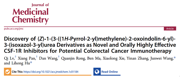 2021年11月4日,药物化学顶尖期刊Journal of Medicinal Chemistry(IF = 7.446,JCR分区:Q1)在线发表了我校药学院胡立宏教授团队的最新研究成果“Discovery of (Z)‑1-(3-((1H‑Pyrrol-2-yl)methylene)-2-oxoindolin-6-yl)-3-(isoxazol-3-yl)urea Derivatives as Novel and Orally Highly Effective CSF-1R Inhibitors for Potential Colorectal Cancer Immunotherapy”。该工作是在前期研究基础上(J. Med. Chem. 2021, 64, 4870-4890.)的又一次新突破,通过对老药Sunitinib进一步的二次开发,发现了一种对结直肠癌具有显著疗效的新型CSF-1R抑制剂,并揭示了其抗肿瘤免疫调节机制。青年教师吕祁和博士生潘祥、研究生王丹为本文的共同第一作者,胡立宏教授和王均伟副教授为本文的共同通讯作者。