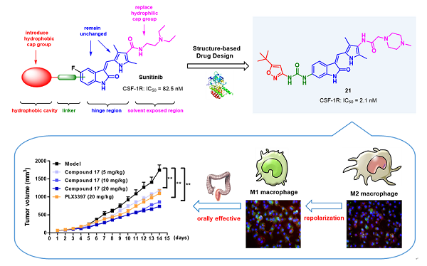 胡立宏教授团队近年来一直致力于老药的二次开发,前期研究通过对老药Sunitinib的二次开发已经获得了一种新型FLT3抑制剂XY0206,目前正在进行复发性/难治性急性髓性白血病的临床试验(NCT04471064),初步临床试验结果显示,药物候选物XY0206对FLT3野生型和突变型具有近50%的完全缓解率,有望产生显著的社会效应和经济效益。Sunitinib是一种多靶点酪氨酸激酶抑制剂,除了特异性抑制FLT3、c-Kit、PDGFRα/β,对CSF-1R也表现出中等的抑制活性。在Sunitinib结构基础上,通过基于CSF-1R结构的合理药物设计,该团队获得了一种结构新颖的高活性CSF-1R抑制剂21。化合物21在C57BL/6小鼠结直肠模型上可以显著抑制肿瘤的生长,同等剂量下的抑瘤效果显著优于上市药物PLX3397。作用机制研究表明,化合物21是通过抑制巨噬细胞向肿瘤细胞趋化,诱导M2型肿瘤相关巨噬细胞向M1表型再极化,实现对肿瘤的免疫治疗。目前大多数开发中的CSF-1R抑制剂作为单一疗法对实体肿瘤的效果有限,特别在结直肠癌的治疗方面尚未取得突破。相关研究已申请发明专利,该团队的研究发现有望为结直肠癌等实体瘤高效、精准的免疫治疗提供新的候选药物。