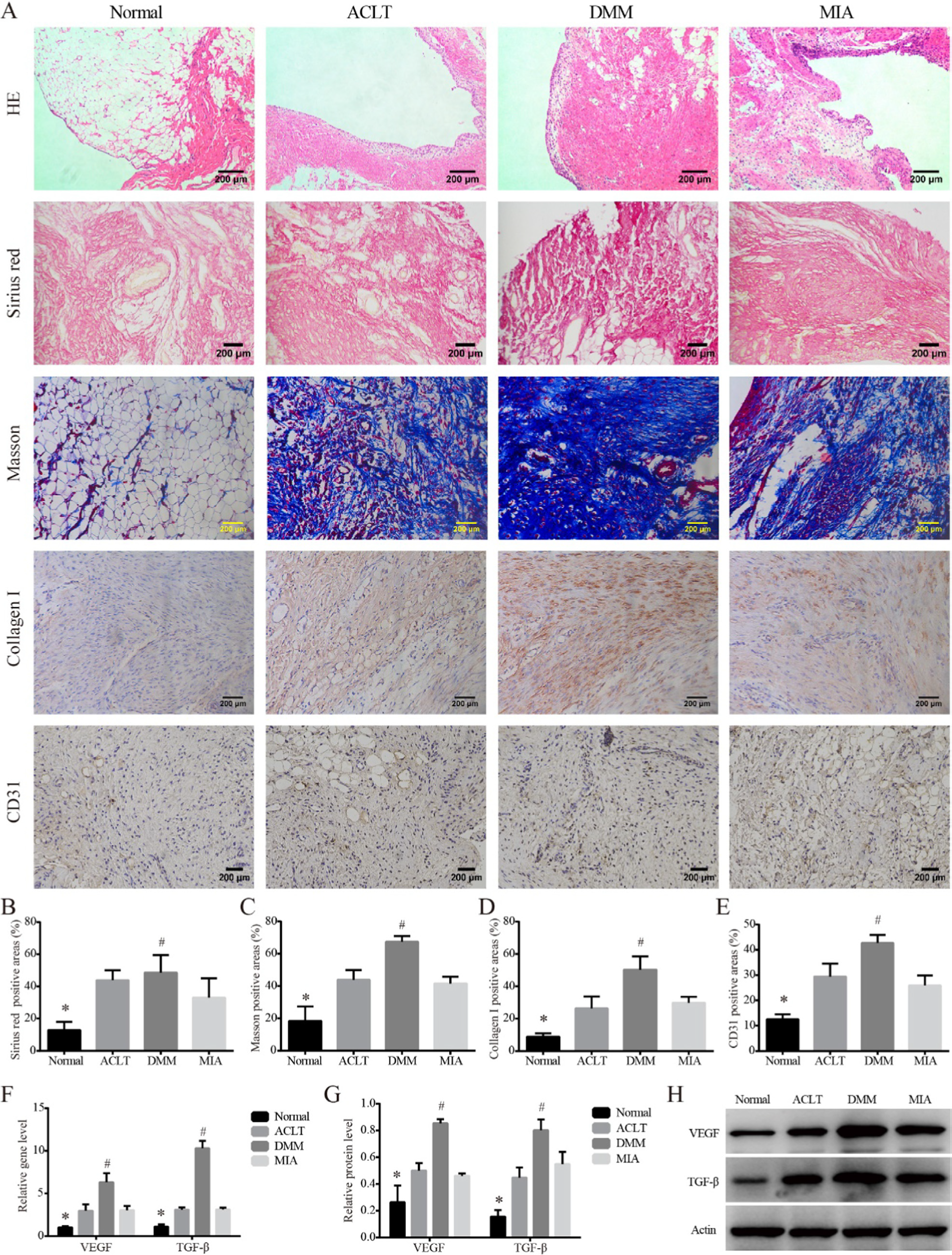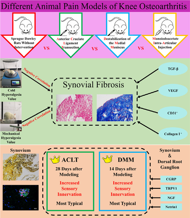 (1)造模14天后,与前交叉韧带离断术(ACLT)、碘乙酸关节腔注射(MIA)相较,半月板失稳术(DMM)构建的KOA模型在滑膜组织中出现更多的I型胶原沉积,CD31阳性区域增加,纤维化相关VEGF、TGF-β表达上调,机械痛敏和冷痛敏的变化在DMM模型中最为典型,机械痛阈值与冷痛阈值均与I型胶原阳性率呈负相关。