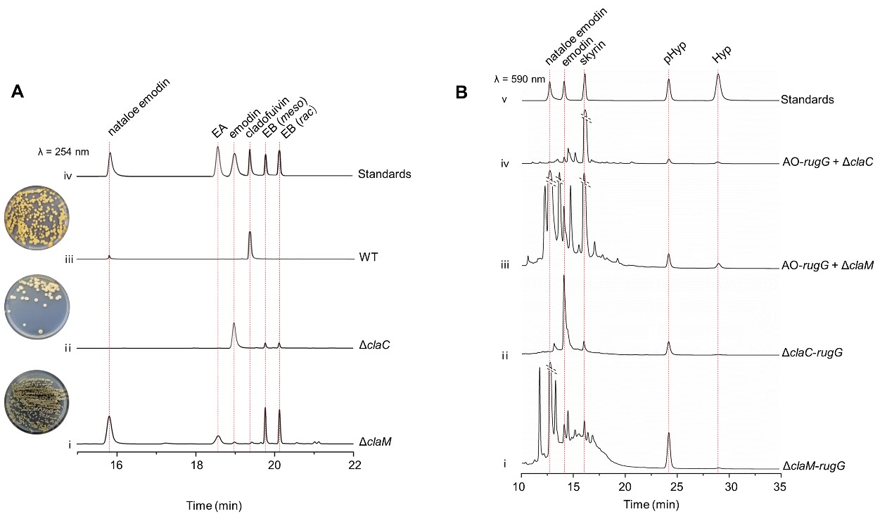 为建立金丝桃素的合成生物学制备策略,作者对Cladosporium fulvum ACCC37291进行基因突变,筛选获得了EB高效表达的突变体。随后尝试了RugG异源表达菌株与EB高产株的共培养,成功合成了金丝桃素;特别是将AO-rugG与ΔclaM共培养,原金丝桃素高达5.66 mg/L。