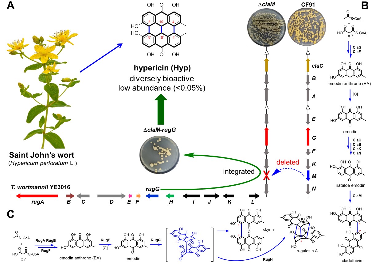谭仁祥教授团队从金丝桃素独特结构出发,巧妙编辑相关微生物的合成步骤,创建了金丝桃素的合成生物学制备策略,实现了金丝桃素的标准化(或发酵法)生产(43.1 mg/L)。