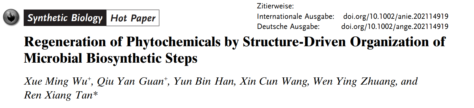 近日,中药品质与效能国家重点实验室(培育)谭仁祥教授团队在化学领域国际知名学术期刊Angew. Chem. Int. Ed.(IF: 15.336,Q1)在线发表中药成分合成生物学制备最新研究成果。