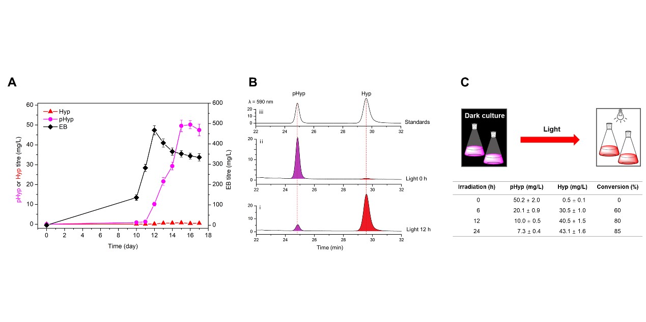 为进一步提高金丝桃素产率,作者用rugG基因去替换ACCC37291菌株的claM基因,获得的ΔclaM-rugG菌株,金丝桃素产率显著提高。再结合发酵工艺优化和光催化方法,用该改良菌株实现了金丝桃素的高效生物合成(43.1 mg/L)。