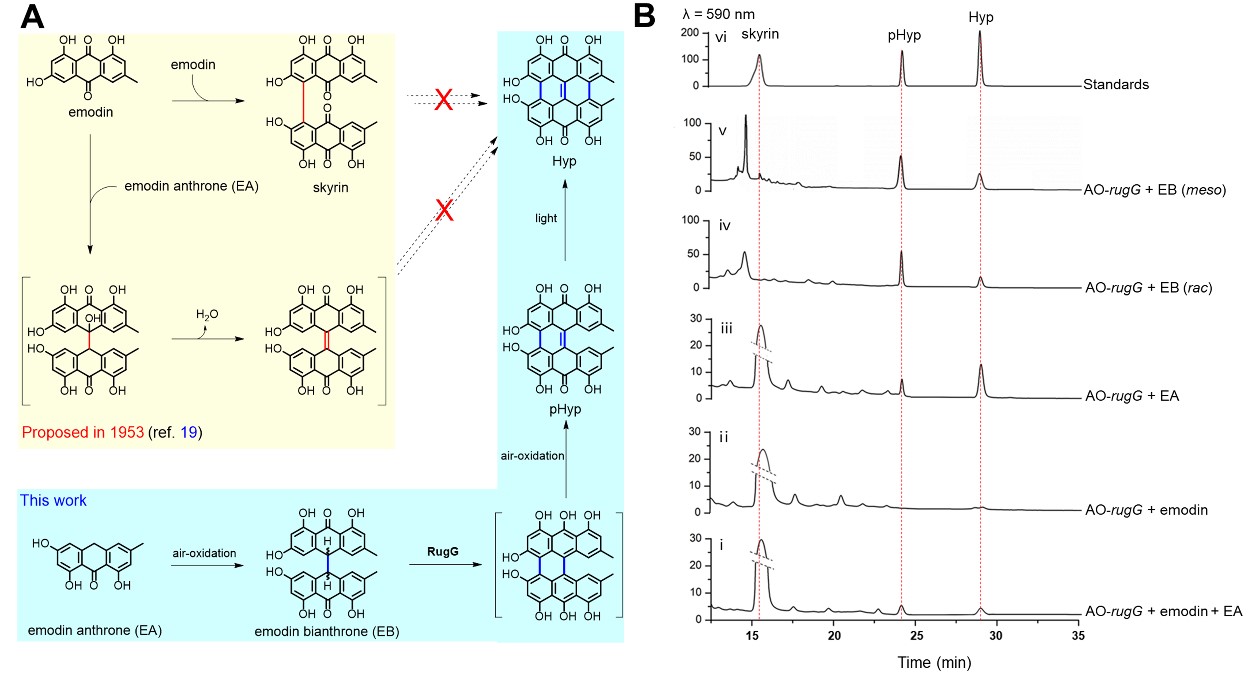 该团队揭示了P450氧化酶RugG可催化大黄素偶联,形成天精(J. Am. Chem. Soc. 2021, 143, 14218;第一作者:韩云宾、白为;通讯作者:谭仁祥)。随后通过异源表达、基因敲除及底物投喂(大黄素、大黄素蒽酮(EA)、天精、大黄素二蒽酮(EB))等方法,发现EB是金丝桃素生物合成的关键前体,而EB是由EA自发氧化聚合而成的。