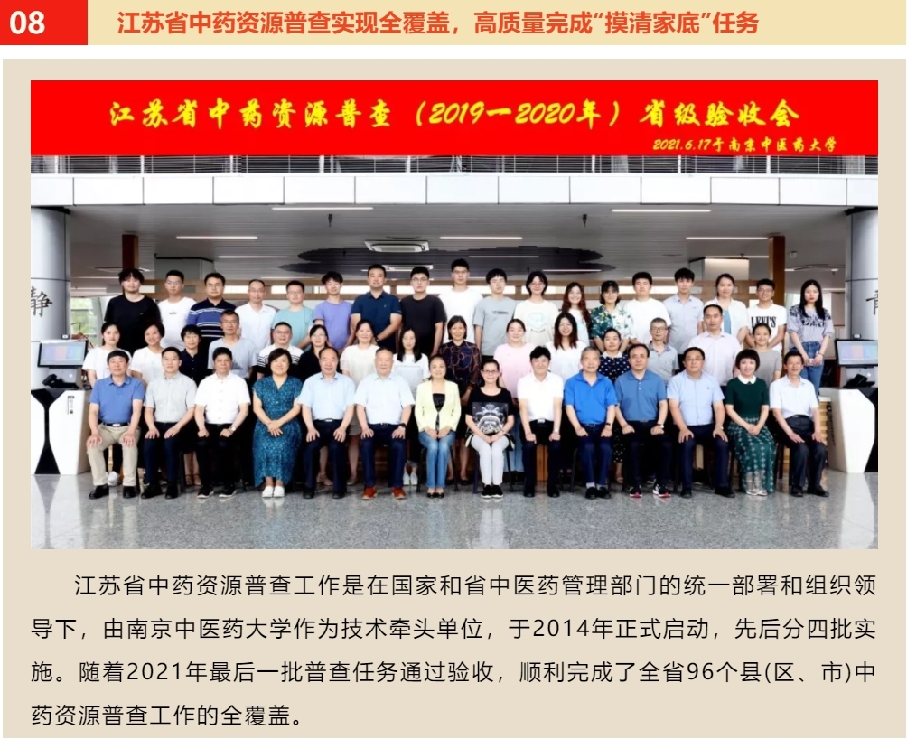 为集中展示2021年全省中医药事业取得的新成就、新特色、新亮点,增进社会各界对中医药工作的了解、关心和支持,促进中医药行业精神文明建设,积极营造良好的社会舆论氛围,进一步推进江苏中医药事业高质量发展和中医药强省建设,在江苏省卫生健康委员会、江苏省中医药管理局支持下,2021年度江苏省中医药十大新闻评选结果于2022年1月15日正式公布,“江苏省中药资源普查实现全覆盖,高质量完成‘摸清家底’任务”入选十大新闻。