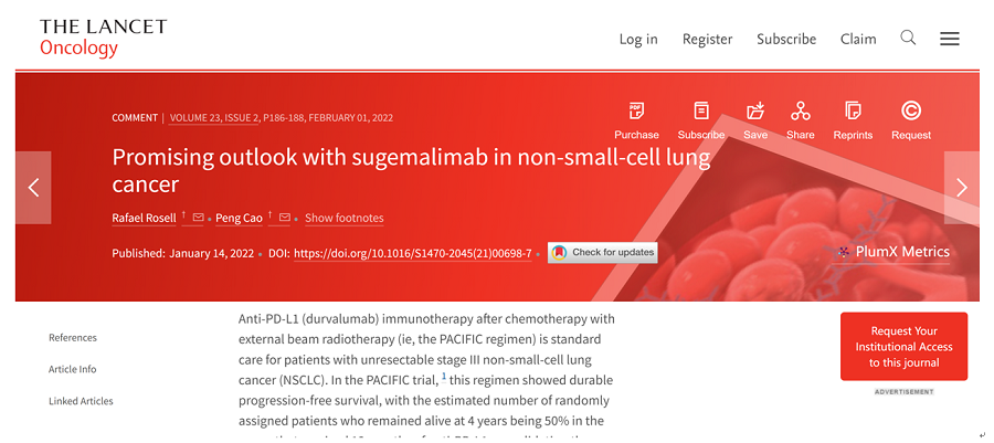近日,william威廉英国官网曹鹏教授联合西班牙巴塞罗那大学Rafael Rosell教授在肿瘤学顶级期刊The Lancet Oncology(IF: 41.316,医学一区)发表题为 “Promising outlook with sugemalimab in non-small-cell lung cancer” 的评论性文章。