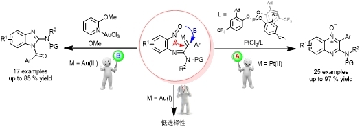 本项研究发现在苯并呋咱和炔酰胺的关环反应中,产物选择性可以通过二价铂和三价金催化剂进行调控。利用大位阻亚磷酸酯配位的铂催化剂可以调控反应生成喹喔啉氮氧化物,而通过2,6-二甲氧基吡啶配位的三价金催化剂可促进反应生成2-胺基苯并咪唑化合物。通过机理实验和理论计算证明高亲电性的三价金卡宾更具有碳正离子的性质,有利于亲氧性环化,而偏向卡宾性质的铂卡宾则更容易被氮进攻,形成六元环。该工作进一步揭示了不同价态金属卡宾的性质,有助于今后选择性合成方法学的开发。