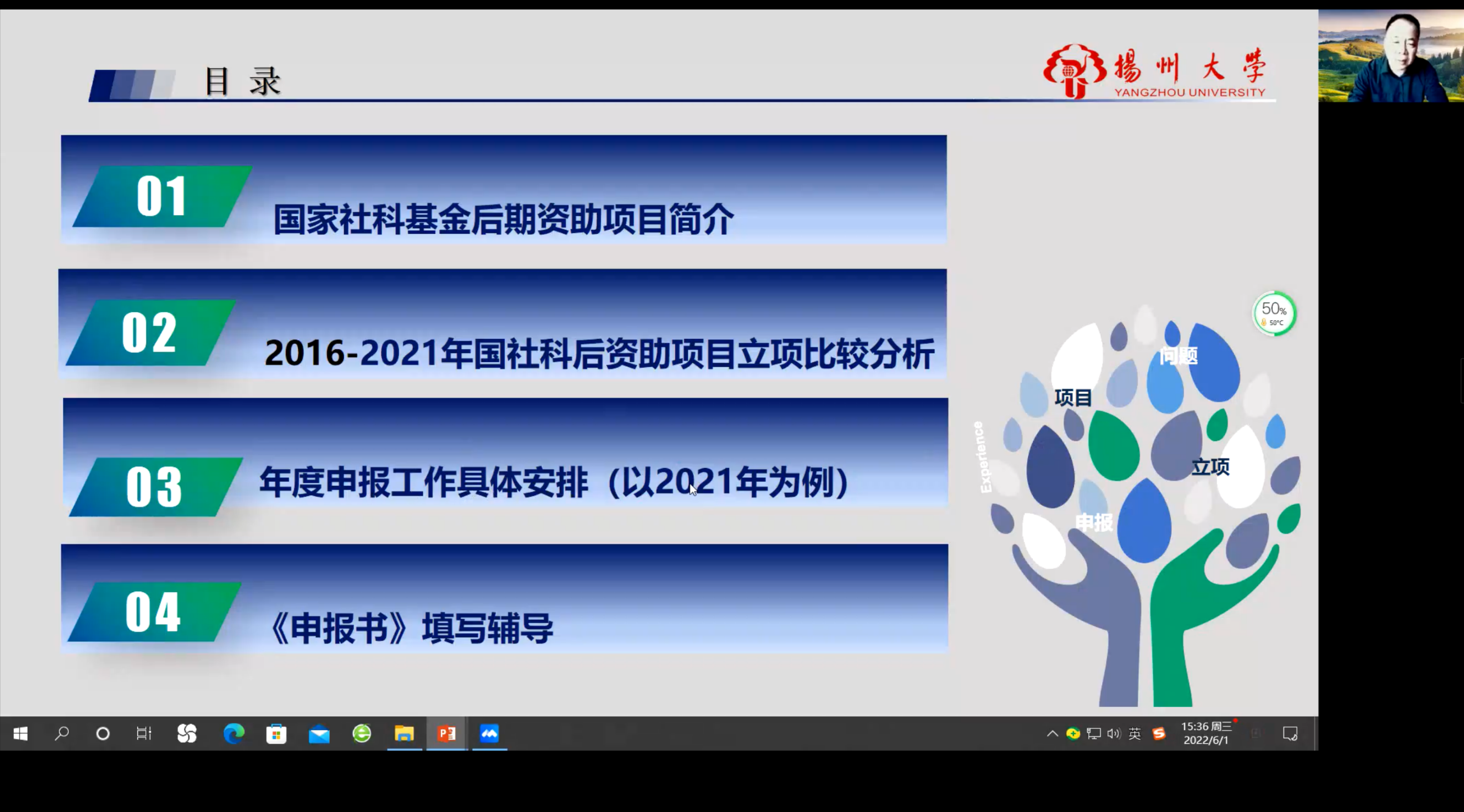 6月1日下午,我校通过视频会议的形式举办了2022年度国家社会科学基金后期资助暨优秀博士论文出版项目申报辅导会,会议邀请了扬州大学马克思主义理论博士后科研流动站站长、扬州大学思想政治教育“国家一流本科专业建设点”负责人佘远富教授作了题为《国家社科基金后期资助项目申报辅导》的专题报告。各文科学院有关负责同志、科研秘书,拟申报教师,科学技术处社会科学管理科全体同志等80余人参加报告会。