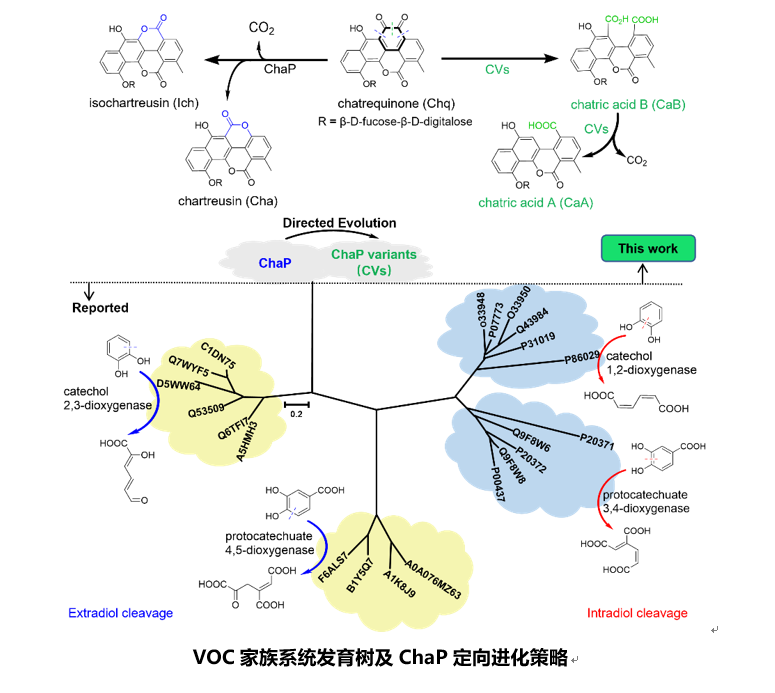 谭仁祥课题组前期在研究抗肿瘤化合物chartreusin生物合成过程中发现,双加氧酶 ChaP可催化含邻苯醌基团的底物chartrequinone氧化重排形成chartreusin。系统发育树分析显示,ChaP属于VOC家族的新分支,在催化机制上与EDOs及IDOs相差较大,但其作用底物与儿茶酚有一定相似性。有研究报道,通过蛋白氨基酸突变,可实现EDOs和IDOs的互相转变。受此启发,定向进化被应用于ChaP 的人工改造。