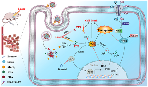 中药鸦胆子降三萜类活性物质鸦胆子苦醇是一种独特的Nrf2通路抑制剂,为了克服光疗中肿瘤微环境处于氧化应激状态,触发抗氧化系统进而干扰药效,团队开发了一种集成光疗纳米平台,可共同递送中药鸦胆子降三萜类活性物质鸦胆子苦醇、光敏剂Ce6和MnO2,通过促进活性氧 (ROS) 的产生、降低肿瘤抵抗力和诱导铁死亡来提高抗胰腺癌效果。其中,释放的鸦胆子苦醇可以有效抑制Nrf2抗氧化防御途径,引起谷胱甘肽过氧化物酶4 (GPX4) 和铁蛋白重链 (FTH) 失活继而引起铁死亡,大大增强抗胰腺癌作用。该工作基于学科交叉研究,通过抑制应激防御系统和诱导铁死亡,克服光疗中因缺氧和高热而引发的肿瘤抵抗,实现了鸦胆子降三萜类活性物质抗胰腺癌提质增效的新突破。相关研究成果以“Enhanced ROS-Boosted Phototherapy against Pancreatic Cancer via Nrf2-Mediated Stress-Defense Pathway Suppression and Ferroptosis Induction”为题发表在美国化学学会旗下著名刊物ACS Applied Materials and Interfaces。陶伟伟教授为该论文第一作者,赵明教授、段金廒教授和孙东东教授为共同通讯作者。