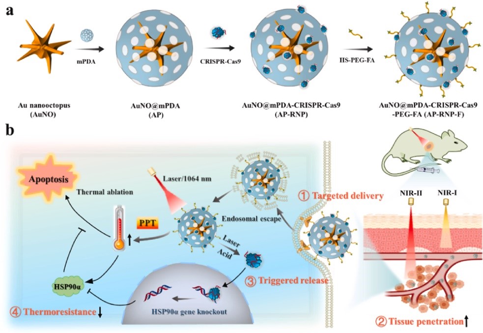 CRISPR/Cas9基因编辑系统在生物、医学等领域表现出巨大应用潜力。传统的方法是利用病毒作为载体,然而病毒会带来突变、免疫反应及毒性等多种风险。为了克服这些障碍,研究团队构建了一种新型纳米载体平台,该平台由多分支金纳米章鱼核心和介孔聚多巴胺壳组成,这种多齿(支)状的金纳米结构在NIR-II窗口显示出明显的局域表面等离子体共振,具有优异的组织穿透能力和高光热转换效率。基于此载体平台,结合精准调控的基因编辑技术,装载了CRISPR-Cas9系统,在光和酸双重刺激下可实现CRISPR-Cas9的靶向输送和触发释放。该纳米复合物可通过下调肿瘤部位靶基因的表达,降低胰腺癌细胞的耐热性,从而促进细胞凋亡。该研究为未来的基因/光热癌症靶向治疗的临床转化提供了巨大潜力。相关研究成果以“Synthesis of multi-branched Au nanocomposites with distinct plasmon resonance in NIR-II window and controlled CRISPR-Cas9 delivery for synergistic gene-photothermal therapy”为题在线发表于生物材料领域权威杂志Biomaterials。陶伟伟教授为该论文第一作者,赵明教授、段金廒教授和马勇教授为共同通讯作者。