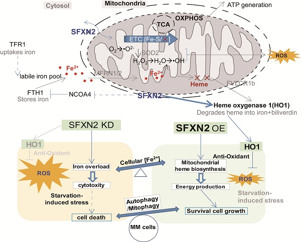 2022年9月,杨烨、顾春艳教授课题组在NPG旗下Cell Death & Disease杂志在线发表研究性论文“Elevated SFXN2 limits mitochondrial autophagy and increases iron-mediated energy production to promote multiple myeloma cell proliferation”。该研究发现Sideroflexin成员之一SFXN2作为线粒体外膜蛋白参与铁代谢和线粒体稳态,这不同于近年Science报道内膜蛋白SFXN1转运丝氨酸参与一碳代谢。重要的是,临床数据显示高表达SFXN2的MM患者预后不良,细胞实验证实SFXN2过表达促进MM细胞增殖并抑制饥饿诱导的线粒体自噬,而SFXN2敲低则加剧MM细胞中线粒体损伤和自噬过程。此外,MM异种移植模型表明,在体内抑制SFXN2表达具有显著的抗MM活性。机制研究表明,具有抗氧化功能的血红素加氧酶1(HO1)参与SFXN2介导的自噬抑制和细胞增殖过程。该研究阐明了SFXN2在MM肿瘤细胞代谢重编程中的重要作用,揭示了SFXN2作为MM患者预后和治疗潜在靶点的可行性。陈颖博士为论文第一作者,青年教师钱进军、博士研究生丁平刚、青年教师王旺为论文共同第一作者,顾春艳教授、杨烨教授为共同通讯作者。该研究获得国家自然科学基金(81970196;82073885)、江苏省优秀青年科学基金项目(BK20200097)、江苏省研究生科研创新计划(KYCX21_1746;KYCX22_1977)等项目资助。