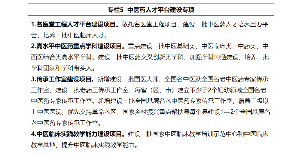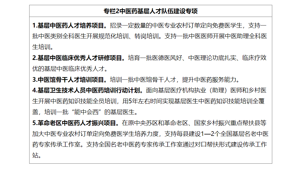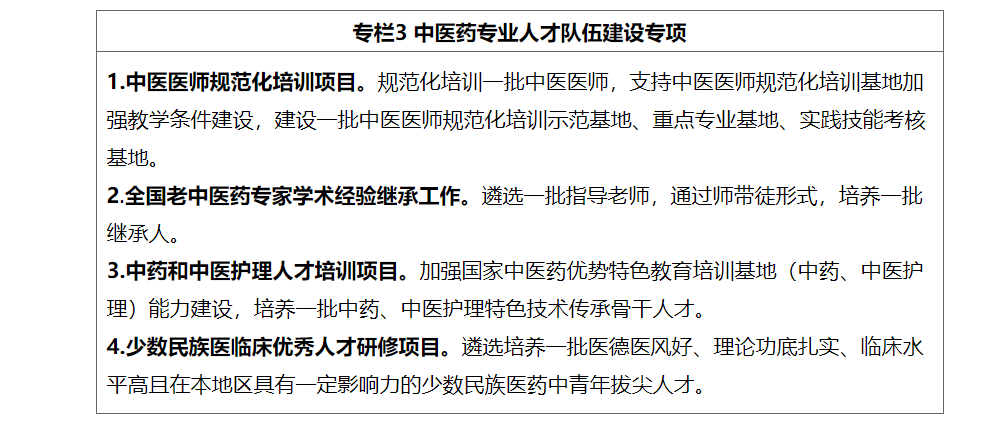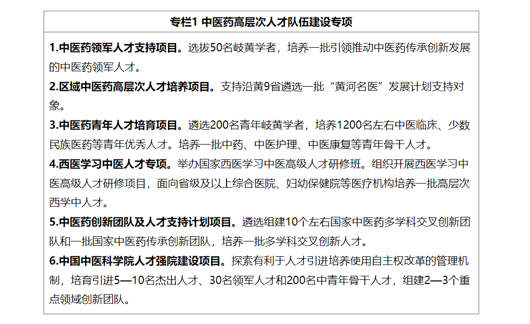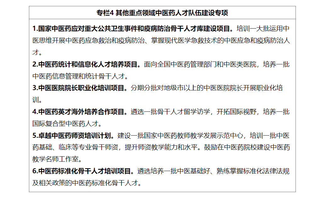 (一)培养中医药急需紧缺人才。依托国家中医疫病防治基地、中医紧急医学救援基地,打造中医疫病防治队伍和紧急医学救援队伍。持续推进中医药应对重大公共卫生事件和中医疫病防治骨干人才库建设。鼓励高等院校和科研院所等开展中医药宏观战略政策研究。服务中医药综合统计制度和信息化建设,加强中医药统计和信息化人员配备,实施中医药统计和信息化人才培养项目。