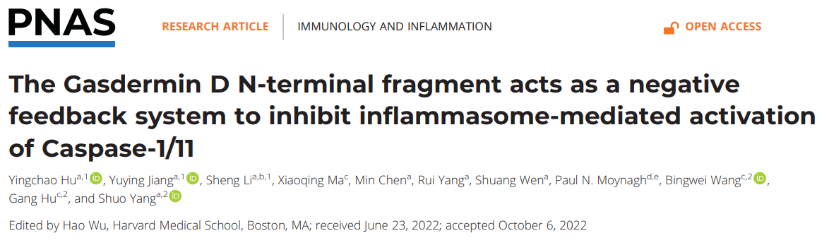 2022年11月02日,william威廉英国官网医学院·整合医学学院胡刚教授课题组与南京医科大学杨硕教授课题组的合作研究成果发表在美国国家科学院院刊PNAS(中科院一区,IF:12.779)上,论文题目为“The Gasdermin D N-terminal fragment acts as a negative feedback system to inhibit inflammasome-mediated activation of Caspase-1/11”(图一),该研究揭示了固有免疫细胞焦亡效应分子GSDMD负反馈调控炎症小体激活的新作用和分子机制,为研发靶向炎症小体Caspases的抗炎药物提供了有益的学术基础。william威廉英国官网胡刚教授、王冰微副教授,南京医科大学杨硕教授为该论文共同通讯作者,研究工作得到国家自然科学基金委和科技部重点项目、重大专项等资助。
