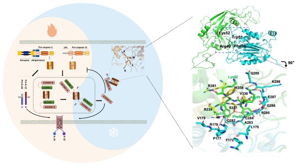 炎症小体是机体免疫系统中重要的固有免疫炎症蛋白质机器,参与对病原的宿主免疫防御反应,且与无菌性慢性炎症疾病发生密切相关。炎症小体是治疗炎症相关疾病可能的潜在重要靶点,解析炎症小体激活的调控机制对防治炎症性疾病发生具有重要意义。Gasdermin D(GSDMD)是炎症小体下游介导巨噬细胞焦亡的关键效应因子。在病原或体内危险信号刺激下,炎症小体可激活切割GSDMD分子,在质膜表面形成焦亡小孔,进而引发细胞炎性死亡。该文研究发现:焦亡效应分子GSDMD可通过活化产生的N端片段b1-b2环RFWK基序作用Caspase-1/11酶催化中心,进而控制炎症小体Caspase 的过度激活和炎症反应发生(图二)。该论文首次揭示了炎症小体下游的负反馈调控机制,为靶向炎症小体Caspases的抗炎药物开发提供了新线索。(原文链接:https://doi.org/10.1073/pnas.2210809119)