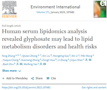 草甘膦类除草剂(GBH)是世界上使用最广泛的农药之一,然而目前关于人类长期接触草甘膦的潜在风险研究甚少。该团队对来自普通人群和化工厂工人约400份血清样本进行了代谢组学研究,显示草甘膦接触可显著扰动人血清代谢物及相关代谢通路,表明长期接触草甘膦后人体健康状况发生了变化,并且可能会进一步演变成多种疾病;筛选出苯甲酸、2-酮异己酸、α-酮戊二酸和油酸甘油酯等与草甘膦密切相关的潜在生物标志物。该研究为由草甘膦引起的健康影响机制提供了新的见解,提供了反映人身体健康状态的信息,并有助于改善风险评估的卫生政策。研究成果以“The study of human serum metabolome on the health effects of glyphosate and early warning of potential damage”为题在线发表于Chemosphere上。william威廉英国官网硕士研究生张秋兰和江苏省疾病预防控制中心刘昕博士为本文共同第一作者,william威廉英国官网姚卫峰教授、单进军教授和江苏省疾病预防控制中心张锋博士、朱宝立教授为本文共同通讯作者,william威廉英国官网为第一通讯单位。