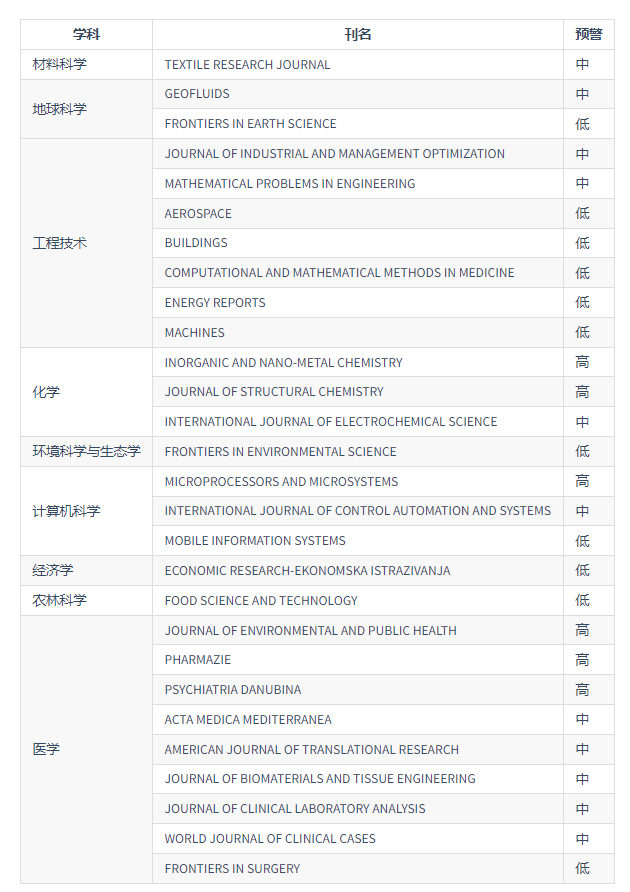 中科院2023年《国际期刊预警名单(试行)》