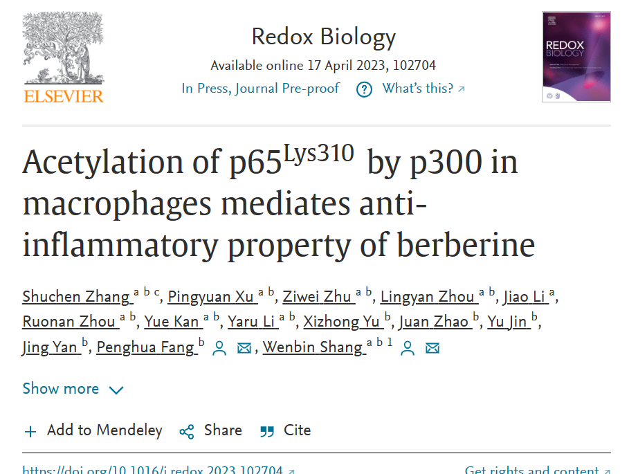 近日,我校第一临床医学院代谢病中医研究重点实验室尚文斌教授团队在国际知名学术期刊Redox Biology(中科院生物学一区,IF: 10.787)上发表中药黄连活性成分小檗碱抗炎作用机制方面的最新研究成果:“Acetylation of p65Lys310 by p300 in macrophages mediates anti-inflammatory property of berberine”。