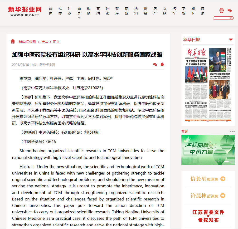 5月10日,新华报业网刊发了我校科学技术处撰写的《加强中医药院校有组织科研 以高水平科技创新服务国家战略》的研究报告。