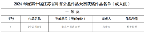 近日,由中国共产党江苏省委员会宣传部、江苏省科学技术协会、江苏省文化和旅游厅、江苏省广播电视局、中国共产主义青年团江苏省委员会联合举办的第十届江苏省科普公益作品大赛评选结果正式公布(苏科协发〔2024〕137号),我校纪录片《守正创新》获成人组(科普影视类)一等奖,是继去年作品《道术合一》后再次获得该奖项一等奖。该片今年同时获得江苏省优秀科普作品一等奖。