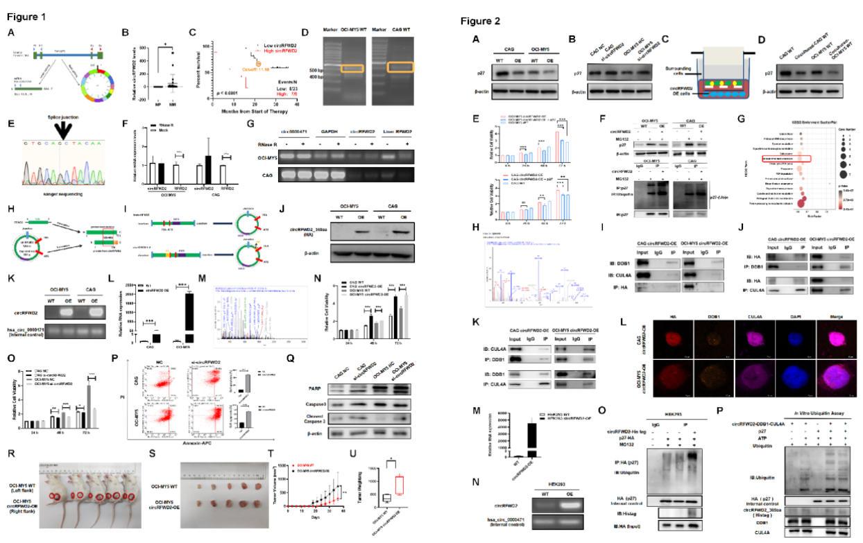 2024年11月22日,Experimental Hematology & Oncology期刊在线发表医学院杨烨、顾春艳教授课题组题为“CUL4A-DDB1-circRFWD2 E3 ligase complex mediates the ubiquitination of p27 to promote multiple myeloma proliferation”的文章。此项研究是继该团队首次证明RFWD2是高危多发性骨髓瘤(MM)的治疗靶点后(Leukemia, 中科院医学一区),发现一种可编码环状RNA——circRFWD2 (hsa_circ_0015361)在MM细胞中表达,并且MM外周血样本中circRFWD2水平的升高与MM患者不良预后密切相关。研究进一步发现其编码蛋白circRFWD2_369aa进入骨髓微环境影响细胞中p27表达水平,继而证实了circRFWD2_369aa可以与CUL4A、DDB1形成E3连接酶复合物调控MM细胞中p27的泛素化水平,探索其促进MM细胞恶性增殖的潜在机制。文章从全新视角提出环状RNA发挥功能作用的途径,加深了当前研究对MM发病机制的理解,揭示了circRFWD2(hsa_ circ_0015361)作为一种新的生物标志物的潜力,有利于提高诊断的敏感性及特异性,为MM精准治疗和预后评估提供了新的思路。