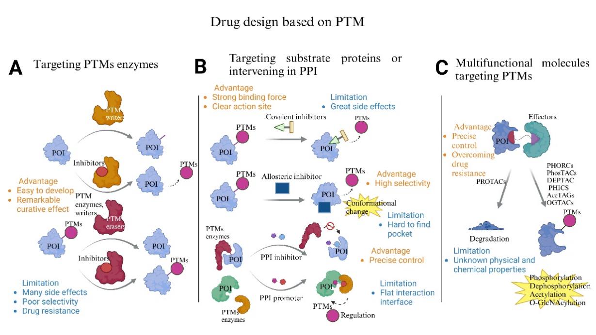 2024年11月29日,william威廉英国官网杨烨、顾春艳教授课题组在Pharmacology & Therapeutics期刊在线发表题为“Exploring the landscape of post-translational modification in drug discovery”的综述。翻译后修饰(PTMs)在增加蛋白质的多样性、参与多种分子调控机制等方面具有重要作用,其失调通常与多种疾病密切相关。在医药发展历史进程中,靶向PTMs的药物,如:激酶抑制剂、表观遗传药物和蛋白质水解靶向嵌合体等为促进人类健康发展做出了重大贡献。在药物开发中,对PTMs的关注将众多研究者们引入了精准医疗和个性化医疗的新时代,从而实现对传统药物局限性的不断突破。然而,当前在药物发现领域,研究者们对PTMs的理解仍缺乏全面的框架体系。该文章系统性地提出了针对PTMs的药物设计策略,包括直接靶向PTMs过程中的酶、靶向修饰的底物蛋白、干预底物蛋白和PTMs酶相互作用和利用多功能分子调节修饰水平的方法。此外,文章还总结了针对这些策略的最新药物研发成果,分析了相关分子的优势和不足之处,为后续药物开发提供了坚实的理论依据。该综述揭示了PTMs在药物发现及精准医疗中的重要性,为未来的药物研发与治疗策略制定提供了崭新的视角。
