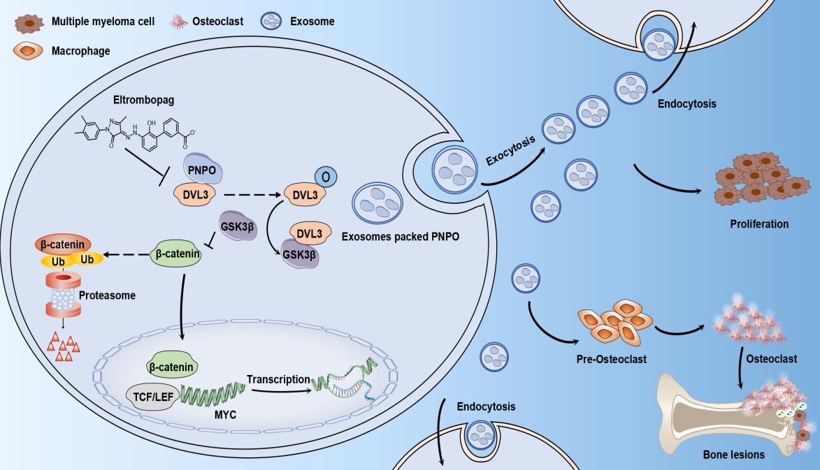 MM的复发难治与其所处的骨髓微环境息息相关,当前MM治疗仍缺乏既可抑制MM细胞增殖也可缓解骨破坏的有效靶点。该研究将“以毒攻毒”治疗恶性肿瘤的中医药理论作为指导方针,应用传统毒性中药来源、具有抗肿瘤活性的天然化合物——雷公藤红素(Celastrol,Cel)为探针,综合运用高通量高灵敏蛋白芯片、蛋白质谱等现代科学技术,筛选并鉴定了与MM细胞异常增殖及骨破坏相关的致癌基因PNPO(Pyridoxine-5'-phosphate oxidase,磷酸吡哆醇氧化酶)。研究首次揭示并验证了PNPO氧化dishevelled 3(DVL3)蛋白M282位点增强其与GSK3β的结合,减少β-catenin的泛素化降解,从而异常激活Wnt/β-catenin信号上调MYC基因表达,增强MM细胞增殖能力的作用机制。此外,该研究基于PNPO主要活性位点R95/K117开展老药新用的筛选,发现促血小板生成素受体激动剂艾曲波帕(Eltrombopag,Elt)可通过靶向PNPO降低其对DVL3的氧化作用,并在细胞、动物乃至临床MM患者的应用中均呈现出良好的抑肿瘤作用。此项研究立足于传统中医药理论,聚焦前沿研究领域,挖掘了MM治疗的新靶标以及Elt应用于MM临床治疗的新策略。