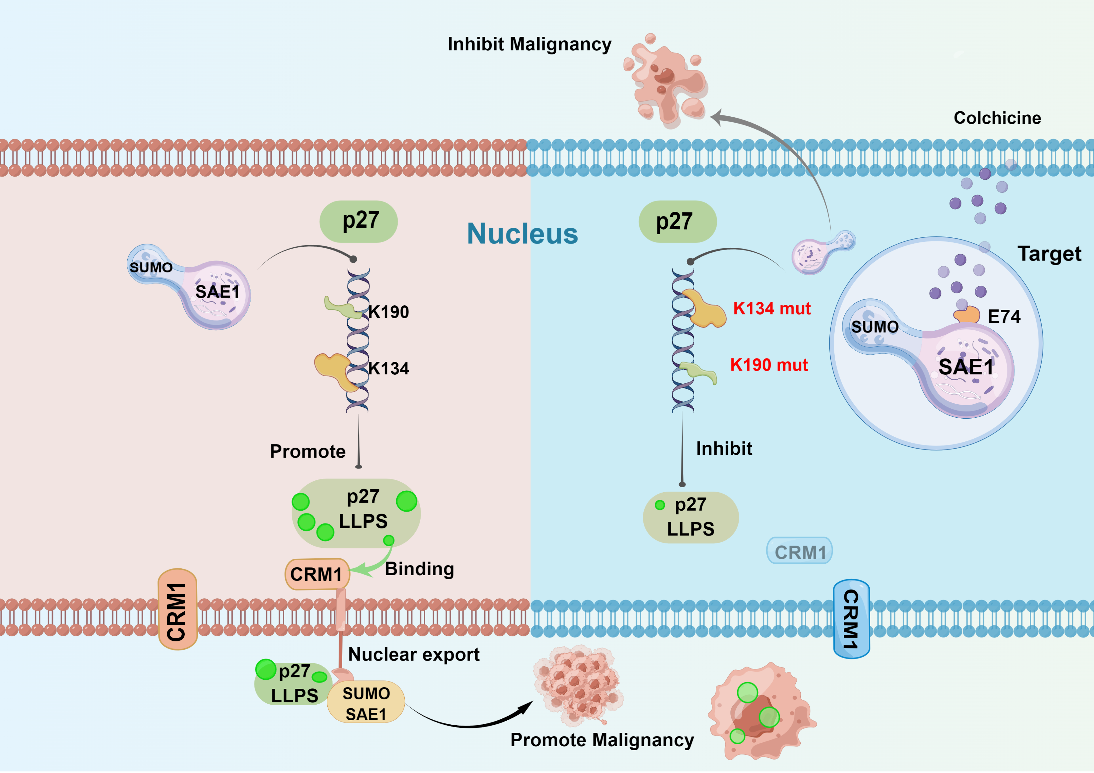 本研究基于"以毒攻毒"的中医理论,系统探究了秋水仙素和秋水仙碱抗MM的作用,并利用Cy5标记的秋水仙来源天然化合物探针进行人蛋白质组微阵列筛选,发现潜在MM靶点——SAE1(SUMO1-activating enzyme subunit 1)。进一步深入机制研究发现,SAE1不仅可以SUMO化修饰p27的K134和K190位点从而增强p27的液液相分离(LLPS),还对“经典抑癌基因”p27在细胞核内外的定位产生重要影响,SUMO化诱导的p27核输出可以促进MM细胞恶性增殖,揭示了PTMs在内在紊乱蛋白相变中的潜在作用机制和功能重要性。研究结果表明,秋水仙碱可以靶向SAE1从而破坏p27的SUMO化,在多种癌症的体内外实验中呈现出优异的抗癌作用。