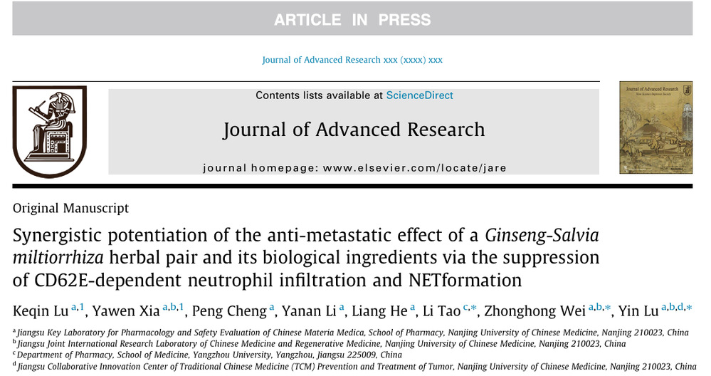 我校药学院陆茵教授课题组长期围绕活血化瘀中药对肿瘤转移是促进还是抑制这个一直困扰中医临床临床的科学问题开展研究,前期已经取得重要的积淀。今年,2024年10月29日在Journal of Advanced Research杂志(IF=11.4,中科院一区)在线发表题为“Synergistic potentiation of the anti-metastatic effect of a Ginseng-Salvia miltiorrhiza herbal pair and its biological ingredients via the suppression of CD62E-dependent neutrophil infiltration and NET formation”的研究论文,从大量的中药复方中发现来源于丹参-人参的组分配伍(隐丹参酮+人参皂苷Rg1)协同抑制肿瘤血行转移过程中NETs介导的癌栓形成关键环节,其深入的分子机制研究丰富了活血化瘀抗肿瘤血行转移的科学内涵,为临床活血化瘀药配伍抑制肿瘤转移提供重要的支撑,为抗肿瘤转移中药新药的研制提供了理论和实验依据。