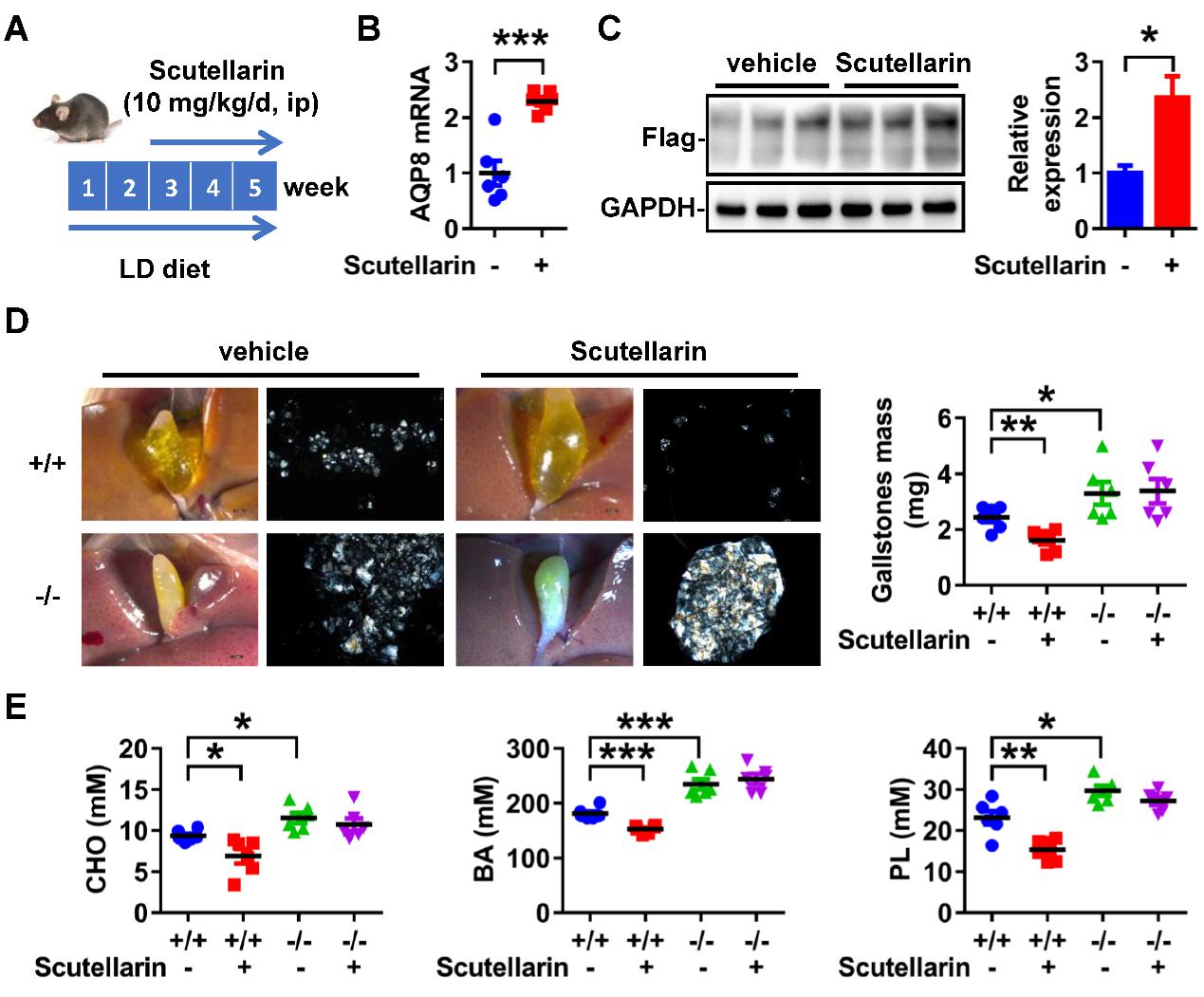2024年9月24日,我校药学院麻彤辉教授课题组与大连医科大学马骁驰教授课题组在肝脏研究领域顶刊Journal of Hepatology(IF=26.8)在线发表题为“Hepatocyte Aquaporin 8-mediated Water Transport Facilitates Bile Dilution and Prevents Gallstone Formation in Mice”的研究论文,该研究发现肝细胞毛细胆管膜水通道蛋白AQP8高效介导水转运的分子机制,可促进小鼠胆汁稀释和防止胆结石形成;通过构建AQP8调控的高通量筛选体系,对中医治疗胆结石的20种常用“利胆”中药进行筛选,从中药灯盏细辛中分离出药效活性小分子-野黄芩苷(Scutellarin)。体外研究表明,野黄芩苷显著上调原代培养肝细胞AQP8 mRNA和蛋白表达。体内研究显示野黄芩苷显著增加胆汁流量,降低胆汁中胆固醇、胆汁酸和磷脂等脂质浓度,并阻止高脂饲料诱导的胆固醇结石形成,而对AQP8-/-小鼠无明显影响。分子机制研究表明,野黄芩苷通过抑制AQP8的转录负调控因子HIF-1α与HSP90的相互作用,促进了HIF-1α的泛素化降解,从而上调AQP8基因表达,促进胆汁分泌,发挥利胆作用。