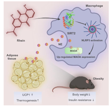 中药大黄活性成分大黄酸在临床上主要用于治疗炎症相关疾病,同时具有良好抗肥胖作用和改善糖脂代谢紊乱作用。然而,大黄酸抗炎和抗肥胖作用的原理一直没有得到明确的阐释,其抗炎作用与抗肥胖作用的关系也不清晰。该研究通过构建巨噬细胞-脂肪细胞共培养系统,首次发现大黄酸通过抑制巨噬细胞内NLRP3炎症小体的活化从而促进脂肪细胞产热。通过进一步的乙酰化修饰组学筛选与基因定点编辑验证,该研究发现大黄酸直接互作于脂肪组织巨噬细胞内的去乙酰化酶SIRT2,并以SIRT2依赖的方式抑制巨噬细胞内NLRP3炎症小体的活化,进而发挥抗炎及促进脂肪组织产热的药理作用。此外,该团队还针对大黄酸的抗肥胖作用开展了随机双盲安慰剂对照的临床研究,结果提示双乙酰大黄酸(双醋瑞因)能过减轻肥胖患者体重,改善代谢异常指标,该论文“Efficacy and safety of diacerein monotherapy in adults with obesity: A randomized, double-blind, placebo-controlled trial”近期将发表在国际学术期刊Diabetes, obesity and metabolism上。两项研究的结果为大黄酸及其衍生物进一步运用于临床肥胖症以及肥胖相关代谢紊乱的治疗提供了重要的基础和临床证据。