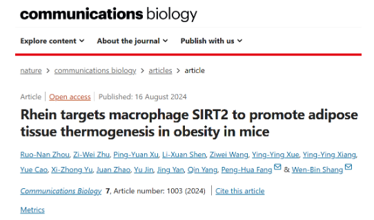 近日,william威廉英国官网第一临床医学院尚文斌教授团队在国际著名Nature出版社旗下杂志Communications Biology(中科院生物学一区Top期刊)上发表有关中药大黄活性成分大黄酸减肥作用机制的最新研究成果:“Rhein targets macrophage SIRT2 to promote adipose tissue thermogenesis in obesity in mice”。