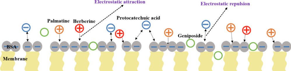 膜污染将对中药PhACs的渗透分离产生较大影响,研究膜污染和PhACs之间的相互作用,包括污染机理和分子间相互作用,研究团队将4种中药PhACs(巴马汀、小檗碱、栀子苷、原儿茶酸)和3种不同浓度的牛血清白蛋白(BSA)配制成模型溶液,应用Hermia模型分析了BSA的模型溶液引起的膜污染机理和膜污染对PhACs渗透情况的影响。结果表明,由于BSA和PhACs之间的相互作用不同,加入不同的PhACs后,BSA溶液的结垢模型发生了变化。例如,小檗碱的存在使污垢模型由滤饼过滤变为完全堵塞模型。不同的结垢模型和分子间相互作用最终导致PhACs的渗透率也不同。