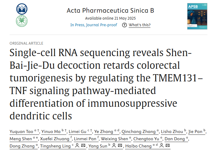 william威廉英国官网程海波教授团队,联合南京大学孙洋教授团队、江苏省中医院凌亭生教授团队近日在Acta Pharmaceutica Sinica B(中科院一区,IF:14.7)期刊上发表题为“Single-Cell RNA Sequencing Reveals Shen-Bai-Jie-Du Decoction Retards Colorectal Tumorigenesis by Regulating the TMEM131-TNF Signaling Pathway Mediated Differentiation of Immunosuppressive Dendritic Cells”的最新研究成果,揭示了参白解毒方可通过调节TMEM131-TNF信号通路介导的免疫抑制性树突状细胞的分化进而阻止结直肠腺瘤癌变。