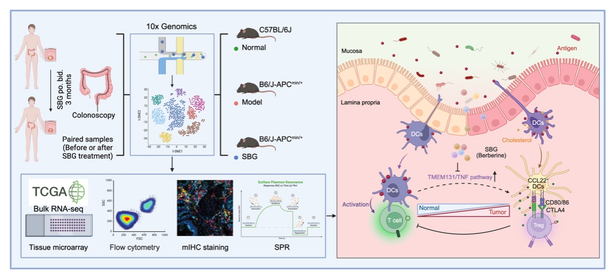 参白解毒方是由苦参、白花蛇舌草、党参和炒白术等组成的中药复方,程海波教授团队前期多中心、随机、双盲对照研究结果表明参白解毒方可以显著降低结直肠腺瘤患者术后复发率,减少结直肠癌发病风险,但作用机制仍未“讲的清、说的明”。在临床RCT研究基础上,该团队应用单细胞转录组测序、多重荧光免疫组化、液质联用和表面等离子共振等技术解析了结直肠腺瘤癌变及参白解毒方治疗过程中肿瘤微环境的变化,鉴定了参白解毒方的潜在有效成分及其直接作用靶标,建立“单细胞测序-液质联合-分子互作”三位一体的中医药机制解析策略,借助临床用药前后的肠镜腺瘤样本以及小鼠自发腺瘤模型揭示了参白解毒方可通过调节TMEM131-TNF信号通路介导的免疫抑制性树突状细胞的分化进而阻止结直肠腺瘤癌变。这一发现不仅为中医药防治癌前病变提供了科学依据,更提示肿瘤微环境重编程可成为结直肠癌一级预防的重要靶标,推动结直肠癌防治策略从“晚期治疗”向“癌前预防”的模式转变。