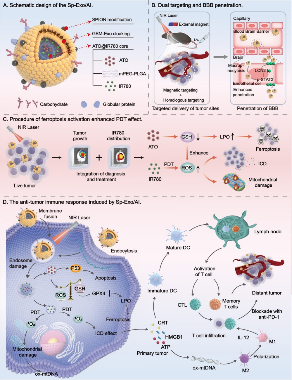 脑肿瘤药物的递送及治疗面临血脑屏障渗透率低及免疫“冷”特征,因此,研究团队基于肿瘤来源外泌体开发了一种同源磁性靶向免疫囊泡,负载的中药砒霜活性成分三氧化二砷通过铁死亡激活,增强光动力疗法促进先天性和适应性免疫。Sp-Exo/AI通过同源归巢和磁导航的大脑双重靶向促进BBB跨越和药物肿瘤积累。经激光照射后,Sp-Exo/AI产生大量ROS,诱导T细胞活化及肿瘤相关巨噬细胞的极化,并联合αPD-1激活效应记忆T细胞从而克服肿瘤免疫逃逸,显著抑制脑胶质瘤生长及复发。