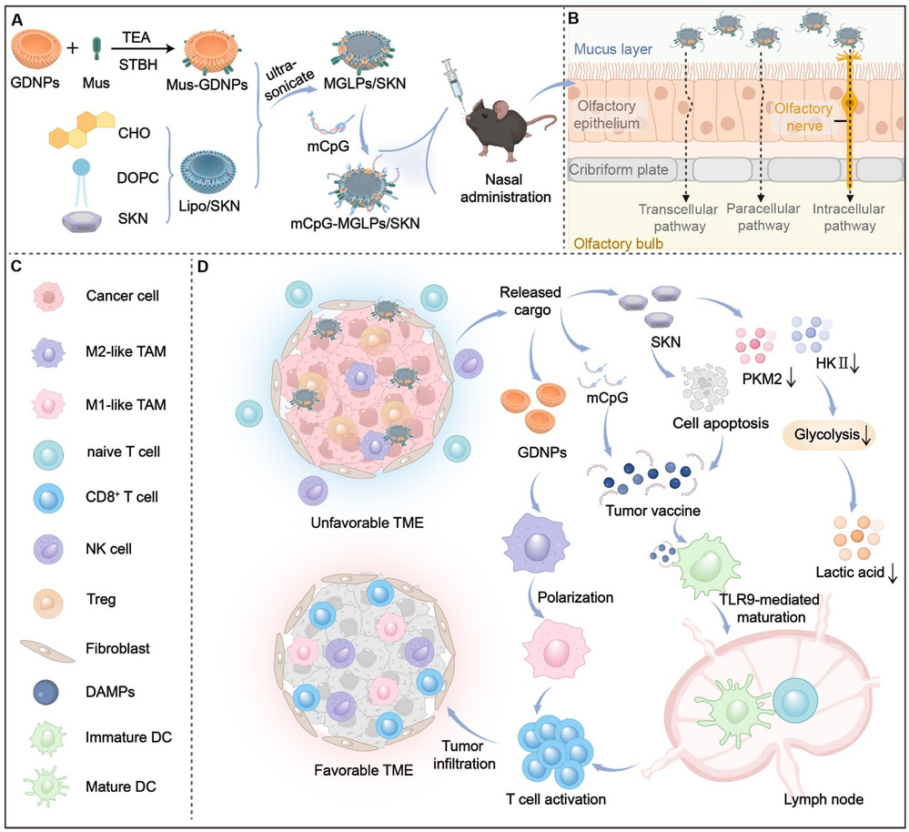 脑胶质瘤的免疫抑制还由糖酵解的过度激活驱动,其代谢产物乳酸的积累促进肿瘤相关巨噬细胞向免疫抑制M2表型转化。因此,课题组提出了一种基于人参囊泡的杂交囊泡原位纳米疫苗,其可通过经鼻递送绕过血脑屏障,增强肿瘤免疫应答的同时抑制糖酵解代谢。人参皂苷Rg3发挥靶向脑肿瘤的作用,随后中药紫草活性成分紫草素诱导免疫原性细胞死亡同时抑制糖酵解限速酶PKM2和HK II,协同人参囊泡的肿瘤相关巨噬细胞极化作用,为先天和适应性免疫诱导提供了一种多管齐下的方法。