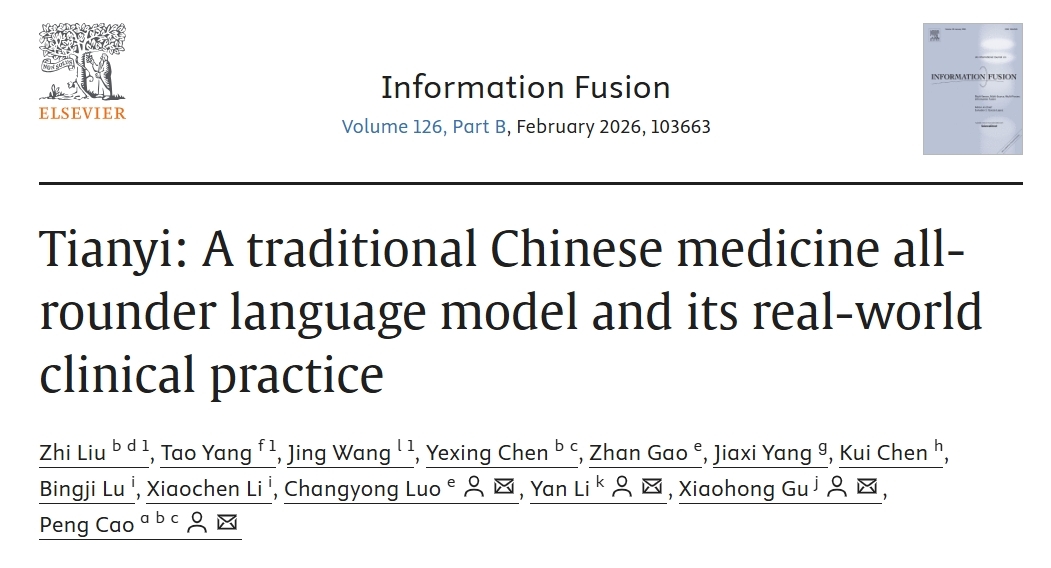 我校曹鹏研究员团队联合北京中医药大学谷晓红教授等团队,在人工智能领域顶级期刊Information Fusion(中科院1区TOP期刊, 影响因子15.5)在线发表了题为“Tianyi: A traditional Chinese medicine all-rounder language model and its real-world clinical practice”的最新研究成果。该研究创新性地以中医辨证论治逻辑体系为指导,首次系统构建了基于“读书-临证-跟师”的多阶段训练策略的中医大语言模型-天医。天医在知识问答、病因分析、证候诊断、治法决策、处方组合、中医临床药效预测等多个方面表现出卓越性能,成为全球首个以中医辨证论治逻辑体系为核心、兼具临床实践能力的专业大语言模型。我校青年博士后刘智为论文第一作者,首都医科大学北京世纪坛医院杨涛和中国中医科学院望京医院王静为论文的共同第一作者。研究获得了国家重点研发计划(2023YFC2308200)及国家自然科学基金项目(82205317, 82405609)等资助。