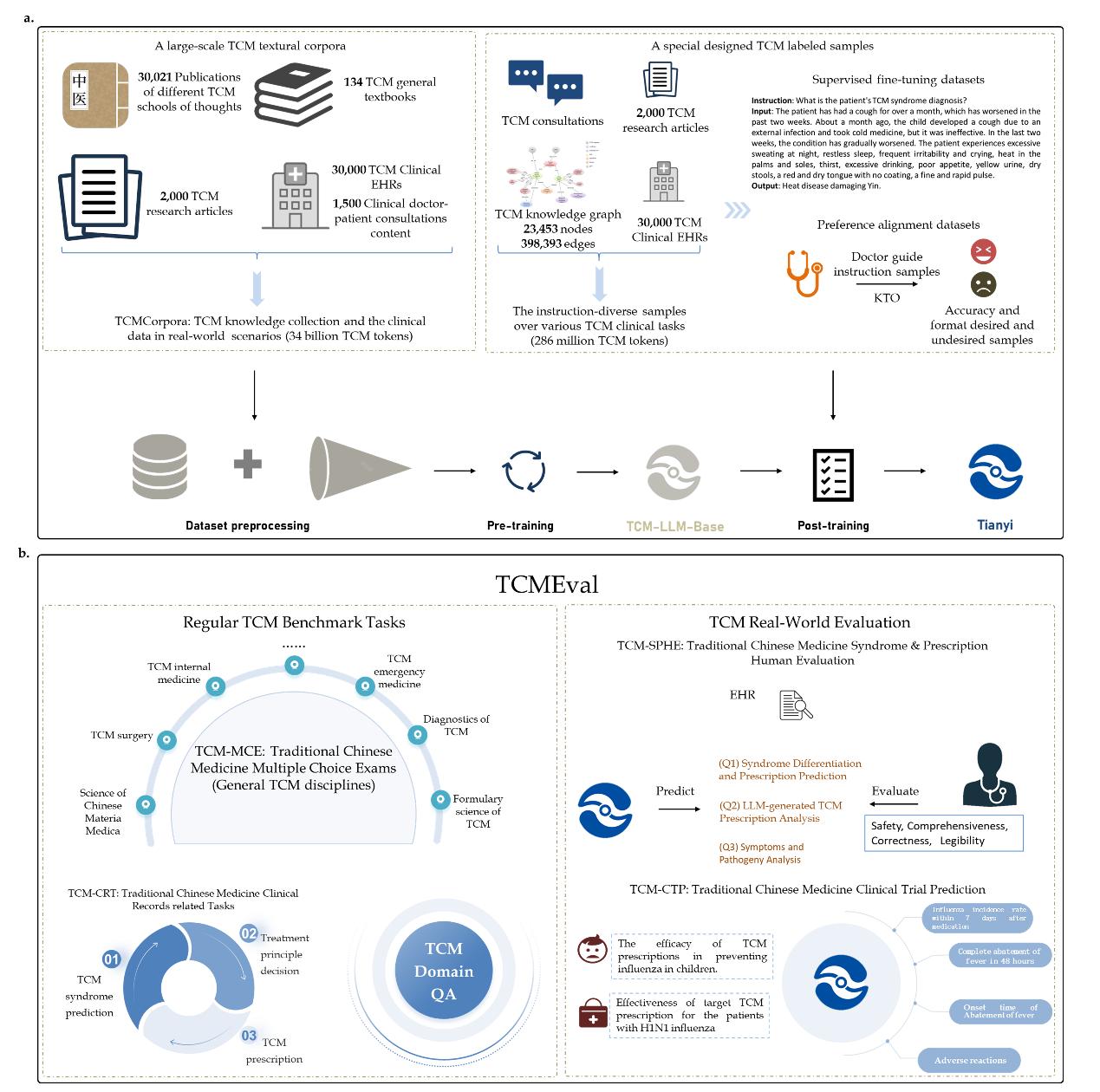 大语言模型(LLM)的发展显著提升了人工智能的拟人化水平和综合性能,并在多个领域展现出强大能力。然而,在专业知识体系复杂的中医领域,通用大模型及现有中医大模型仍面临专业知识匮乏、幻觉现象突出、部署成本较高等挑战。针对这些难题,研究团队基于中医任务特点,在平衡性能与部署成本的前提下,开发了参数量为76亿的中医大语言模型——天医。该模型整合了上百册国家规划教材、3万部中医经典与名医专著、2000余篇学术论文、3万例脱敏临床病历,并纳入2万条结构化知识图谱,总计涵盖34亿个高质量中医语义单元。通过多阶段训练策略,天医实现了对中医知识体系的深度理解。进一步,团队以中医通用问答、证候诊断、治法决策和处方生成为核心任务,通过指令微调与KTO强化学习,确保模型输出严格遵循中医临床辨证论治逻辑。
