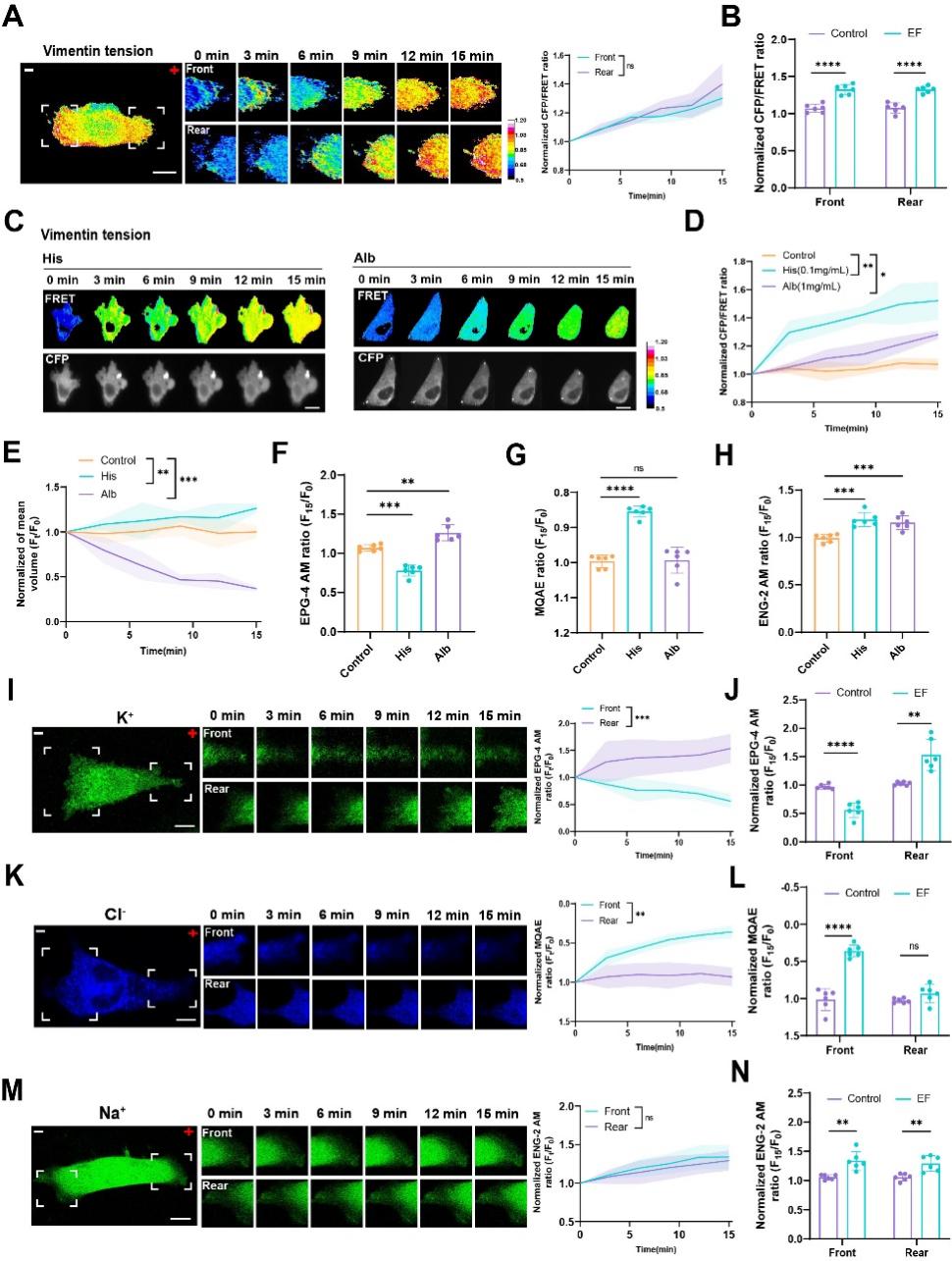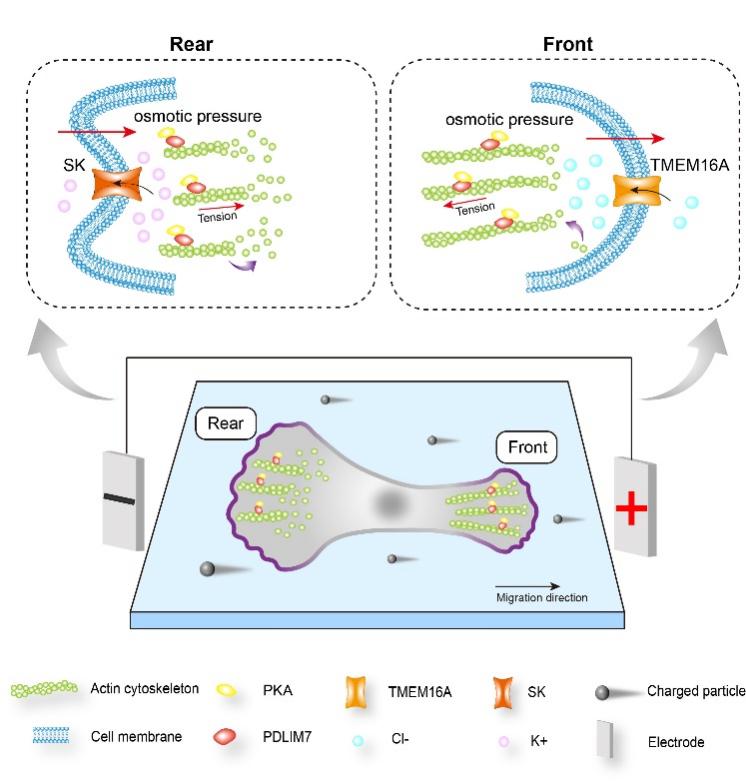 该团队进一步研究发现:电场阳极能刺激细胞前缘去极化低渗膨胀和后缘超极化高渗收缩,这一极化过程密切联系前缘骨架聚合和后缘骨架解聚。同时,去极化的前缘特异性激活氯离子通道TMEM16A,促进氯离子内流;超极化的后缘选择性激活钾通道SK,促使钾离子外排。不同离子的选择性通透,而不是离子总量,驱动了肿瘤的定向迁移。此外,细胞前后缘的渗透压差能招募蛋白激酶A,通过诱导微丝结合蛋白PDLIM7的Ser190磷酸化,增强其与微丝的结合能力,从而形成前后缘高度极化的微丝张力网络,协同渗透张力矢量控制肿瘤迁移的力学效应。