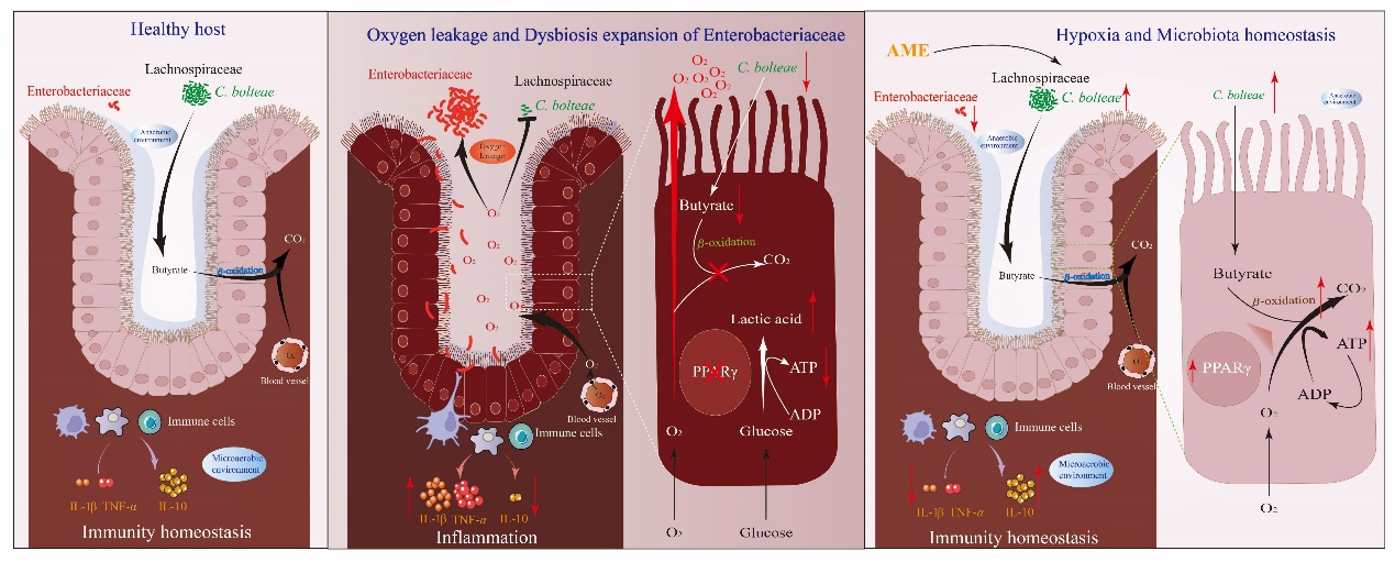 健康的肠腔内为厌氧环境,由此维持肠道菌群的稳态和平衡。肠道出现炎症时,肠道厌氧微环境被破坏,有益的绝对厌氧菌如毛螺菌丰度降低,而有害的兼性厌氧菌如肠杆菌的丰度升高,并进一步加重肠道炎症。因此,恢复肠道厌氧微环境以改善肠道炎症是一种值得探索的策略。